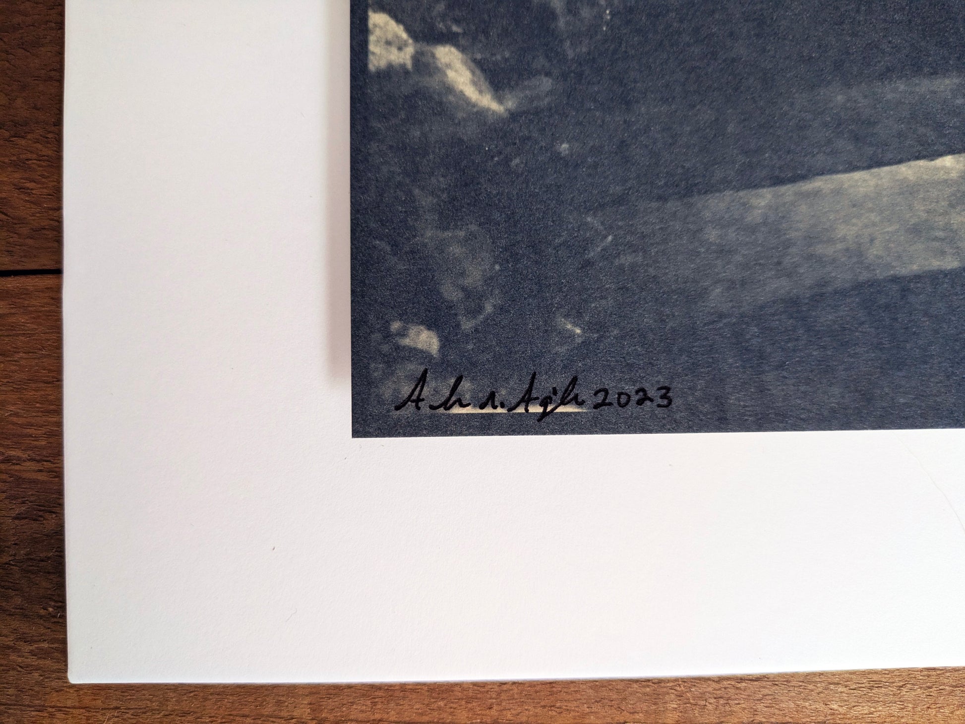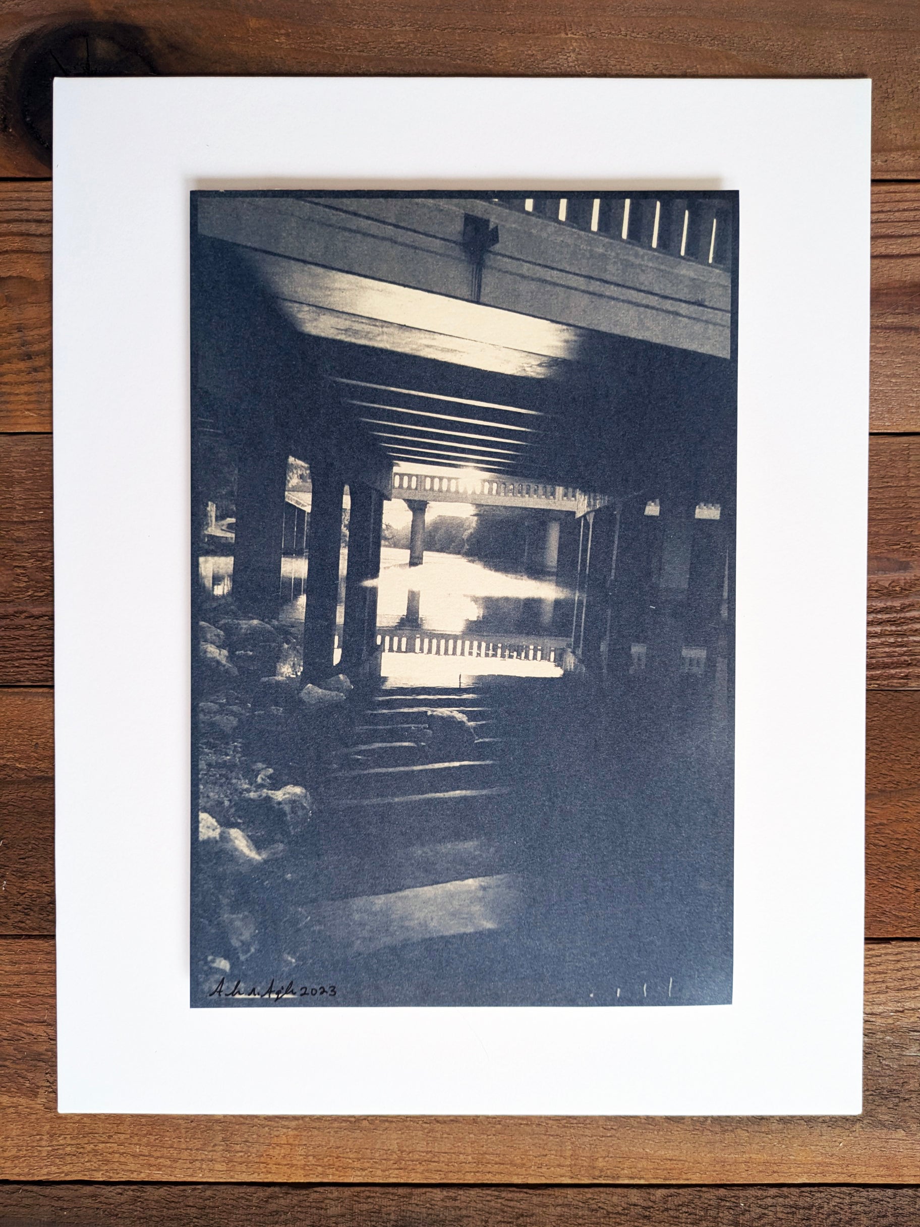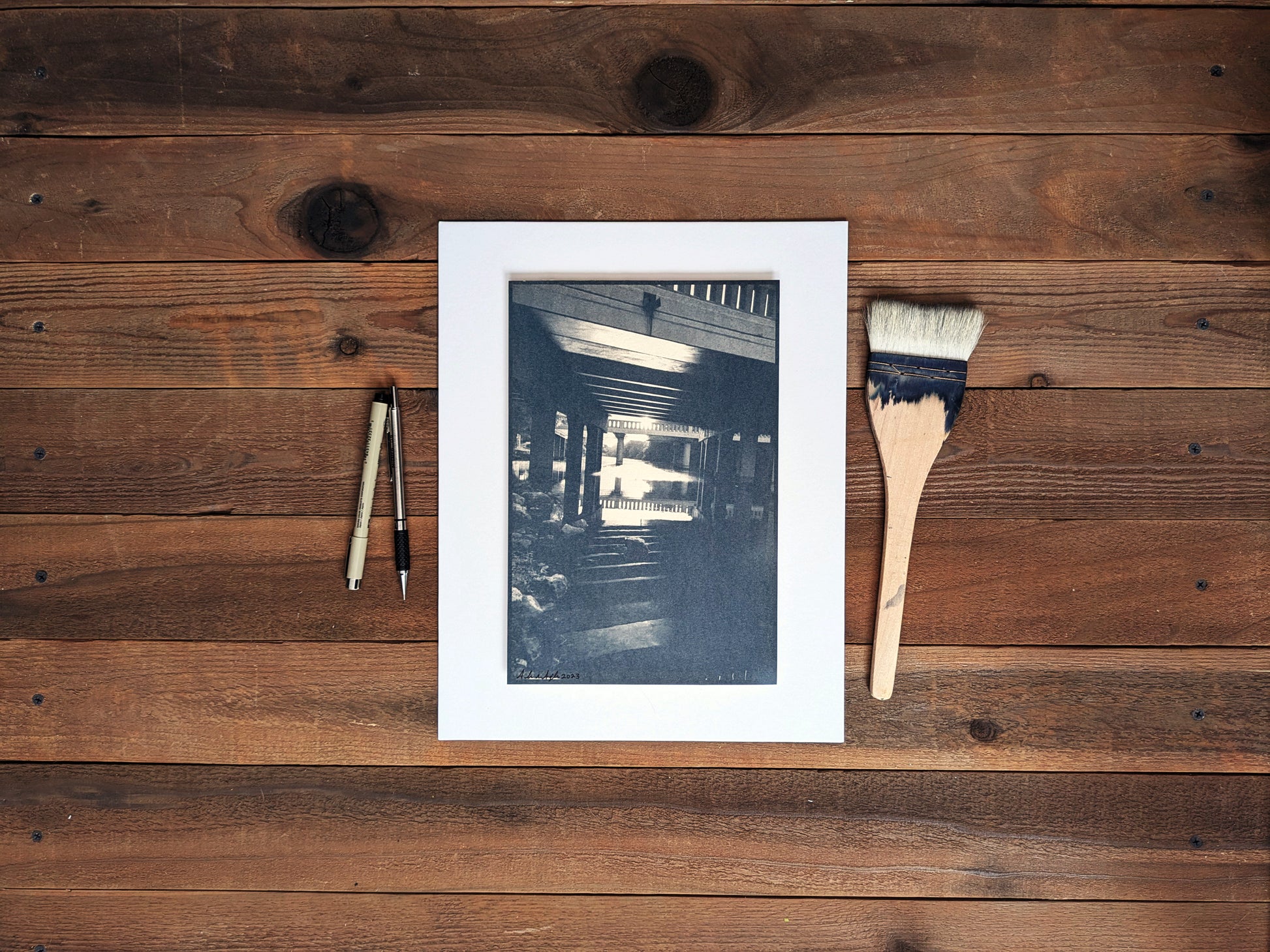 Experience the quiet beauty of a small Texas town with "Boerne River Bridge," an original handmade toned cyanotype print by the artist. This impressive piece, measuring about 7 by 11 inches, is printed on archival hot press watercolor paper and tastefully float mounted on an 11x17 inch matteboard. Ready to frame, it brings a distinctive and captivating element to enhance your home decor.
