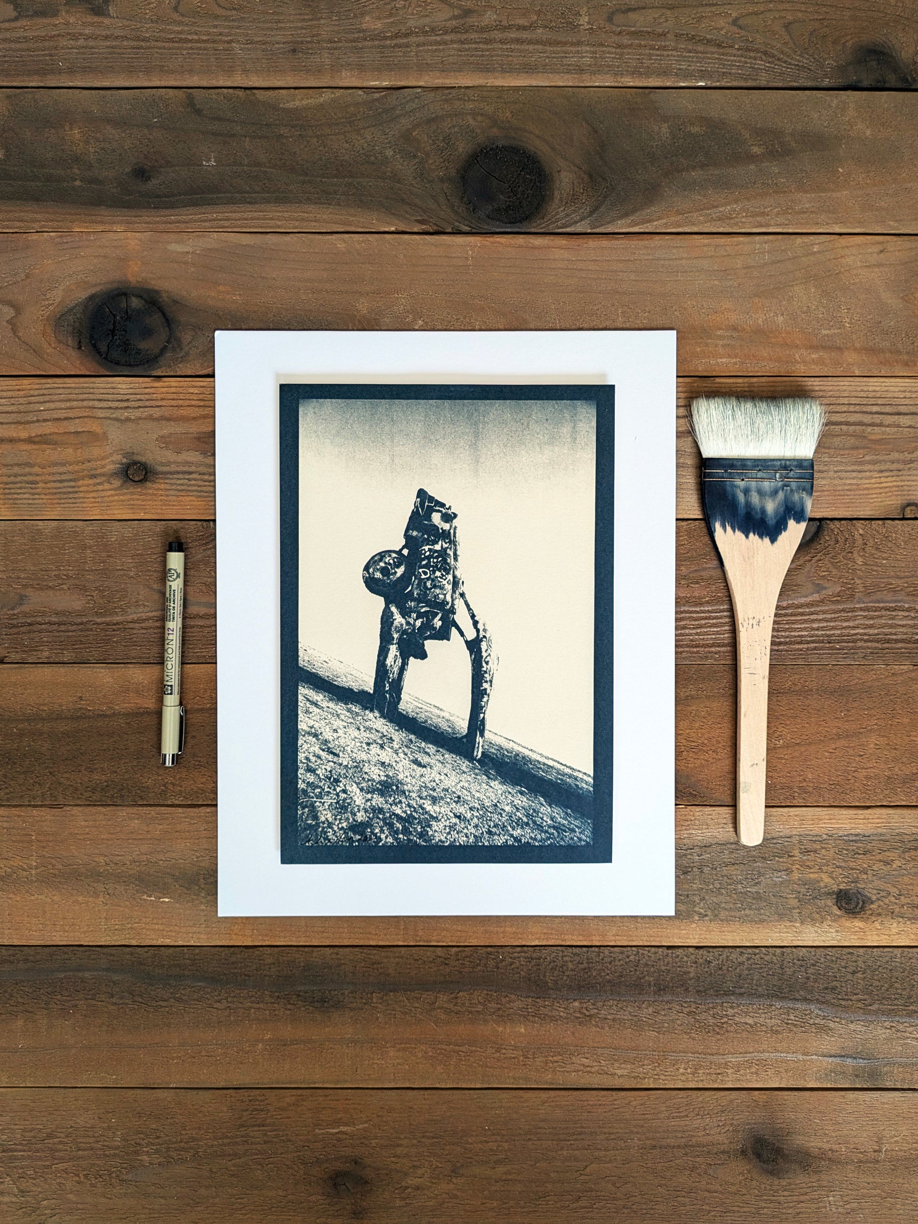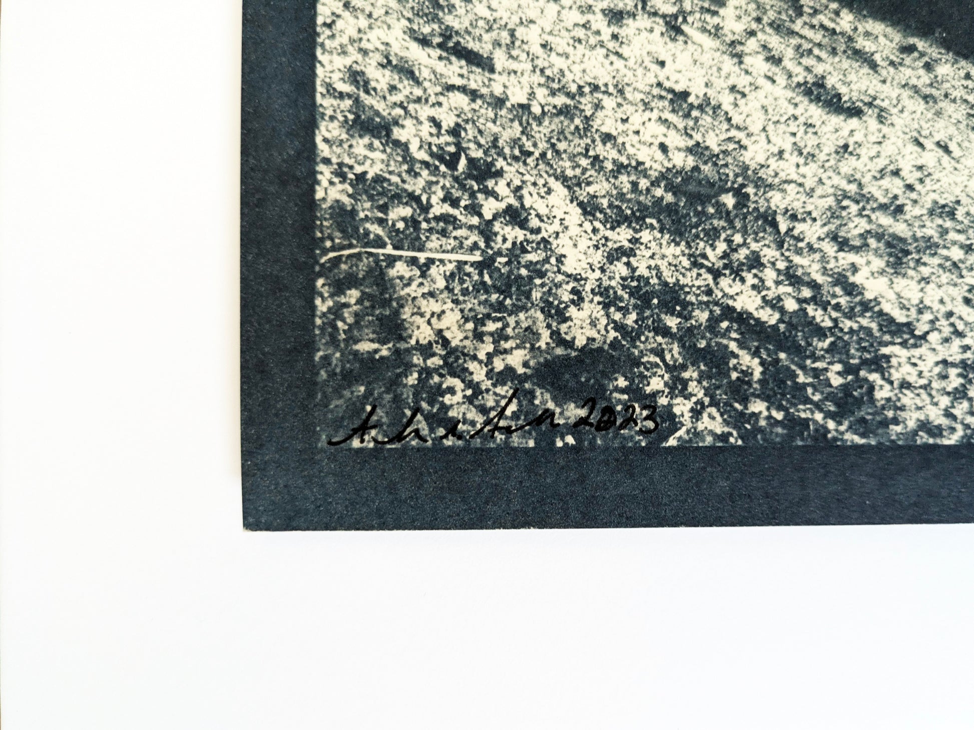 Explore the hidden charm of Texas with "Cadillac Ranch," an original handmade toned cyanotype print created by the artist. Measuring approximately 8 by 11.5 inches, this striking piece is printed on archival hot press watercolor paper and elegantly float mounted on an 11x17 inch matteboard. Perfectly prepared for framing, it will add a unique and captivating touch to your home decor.