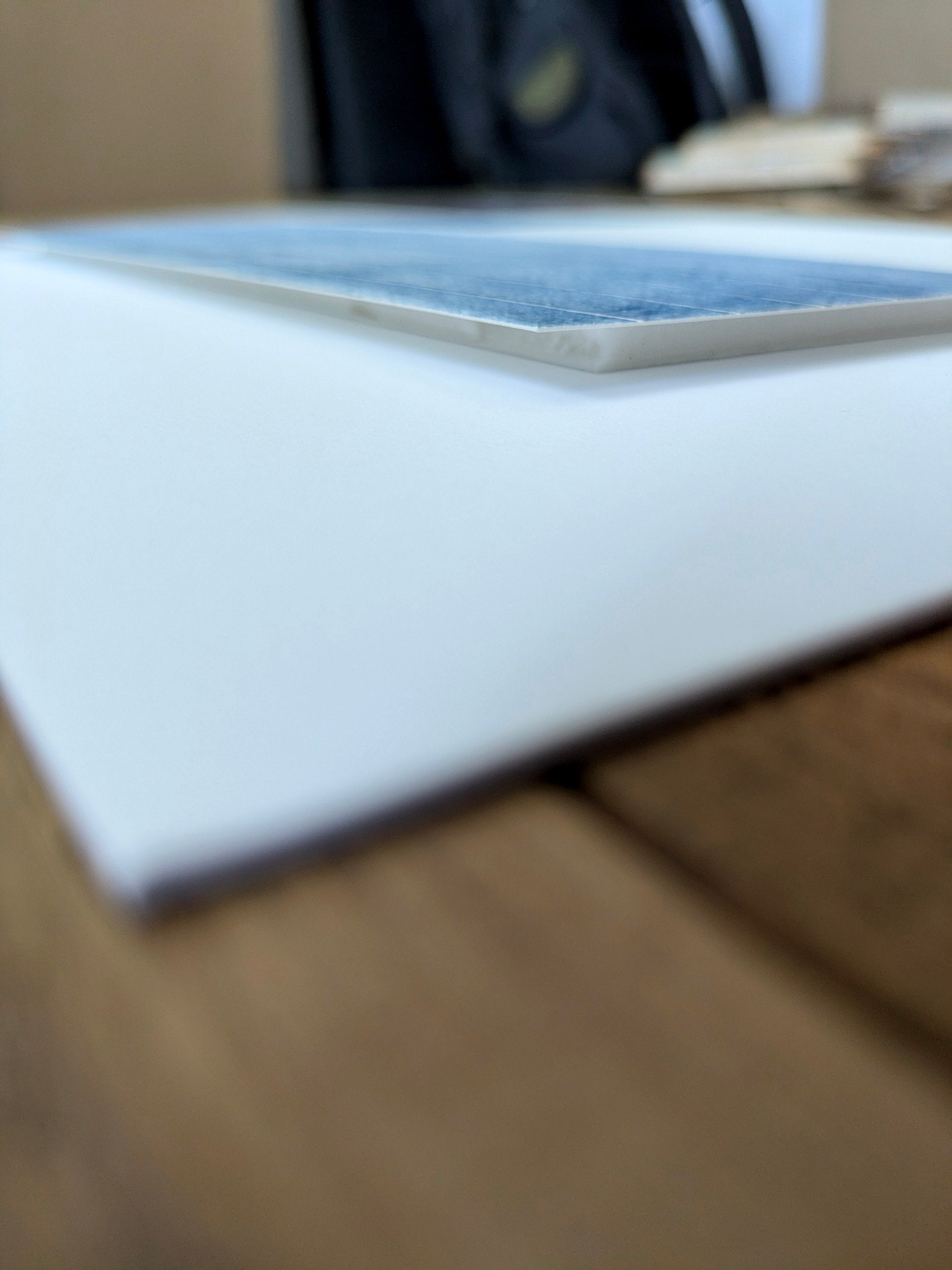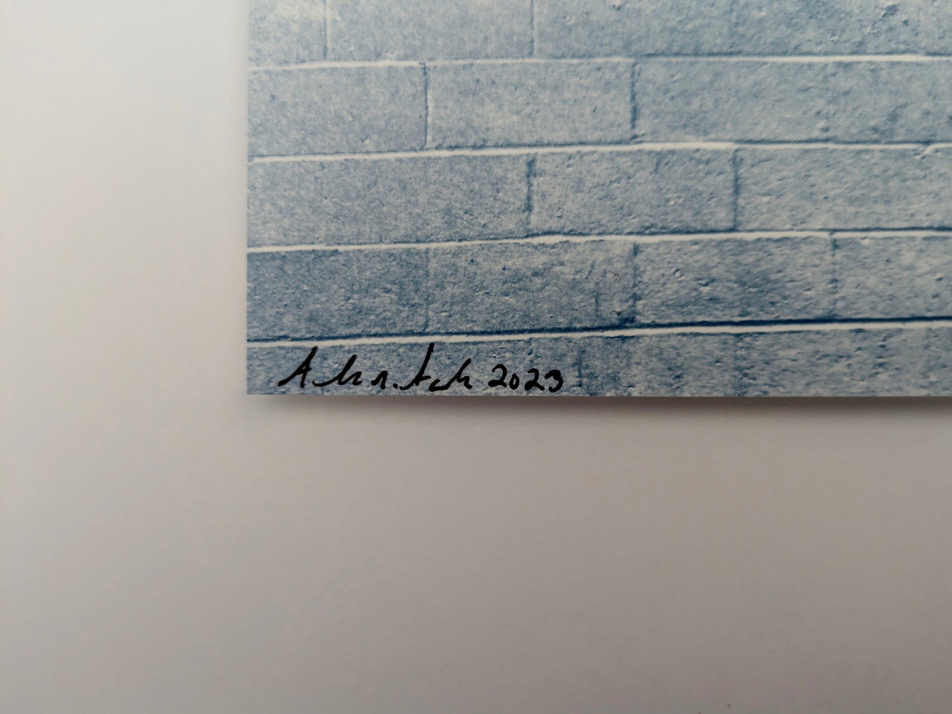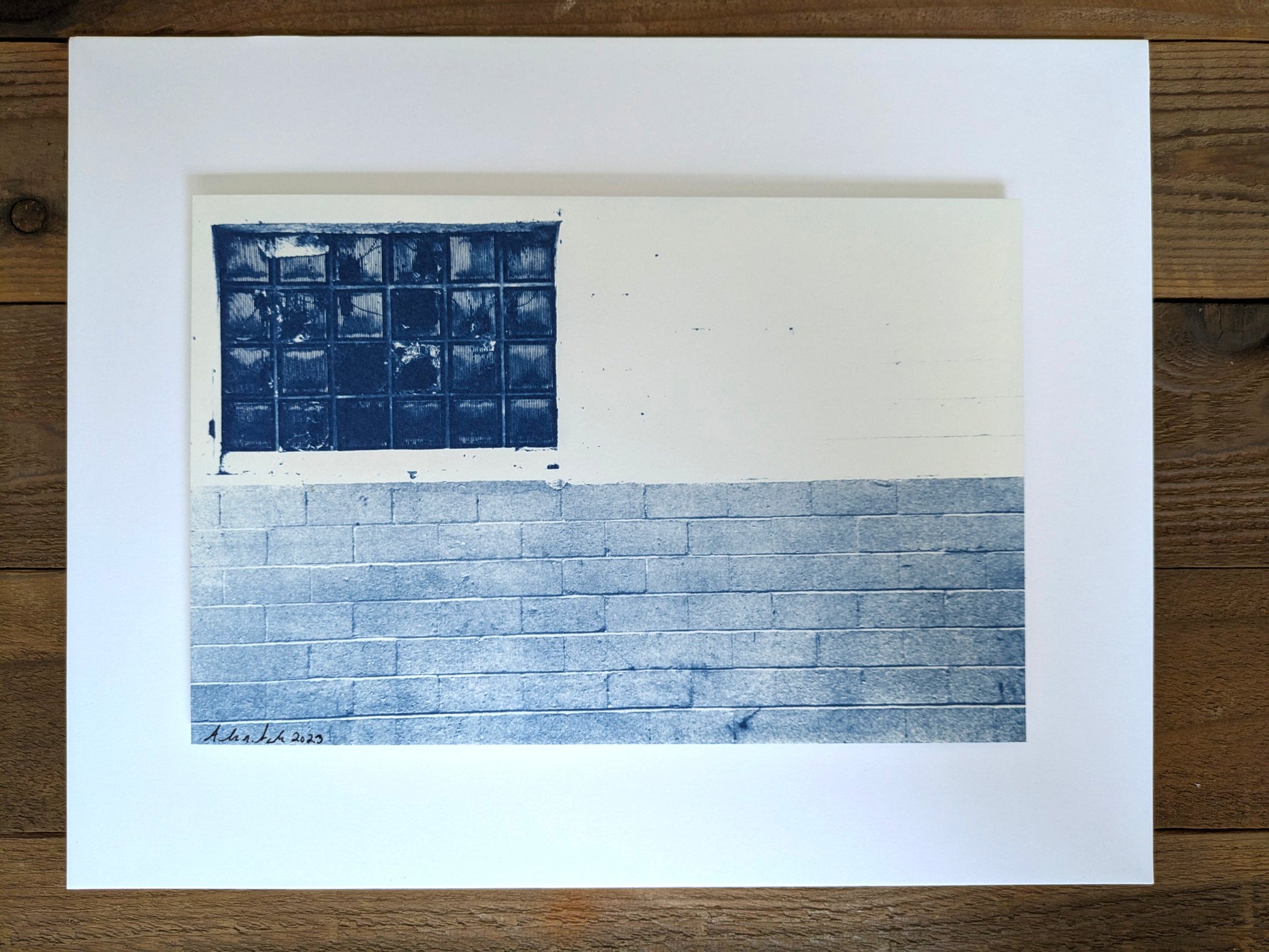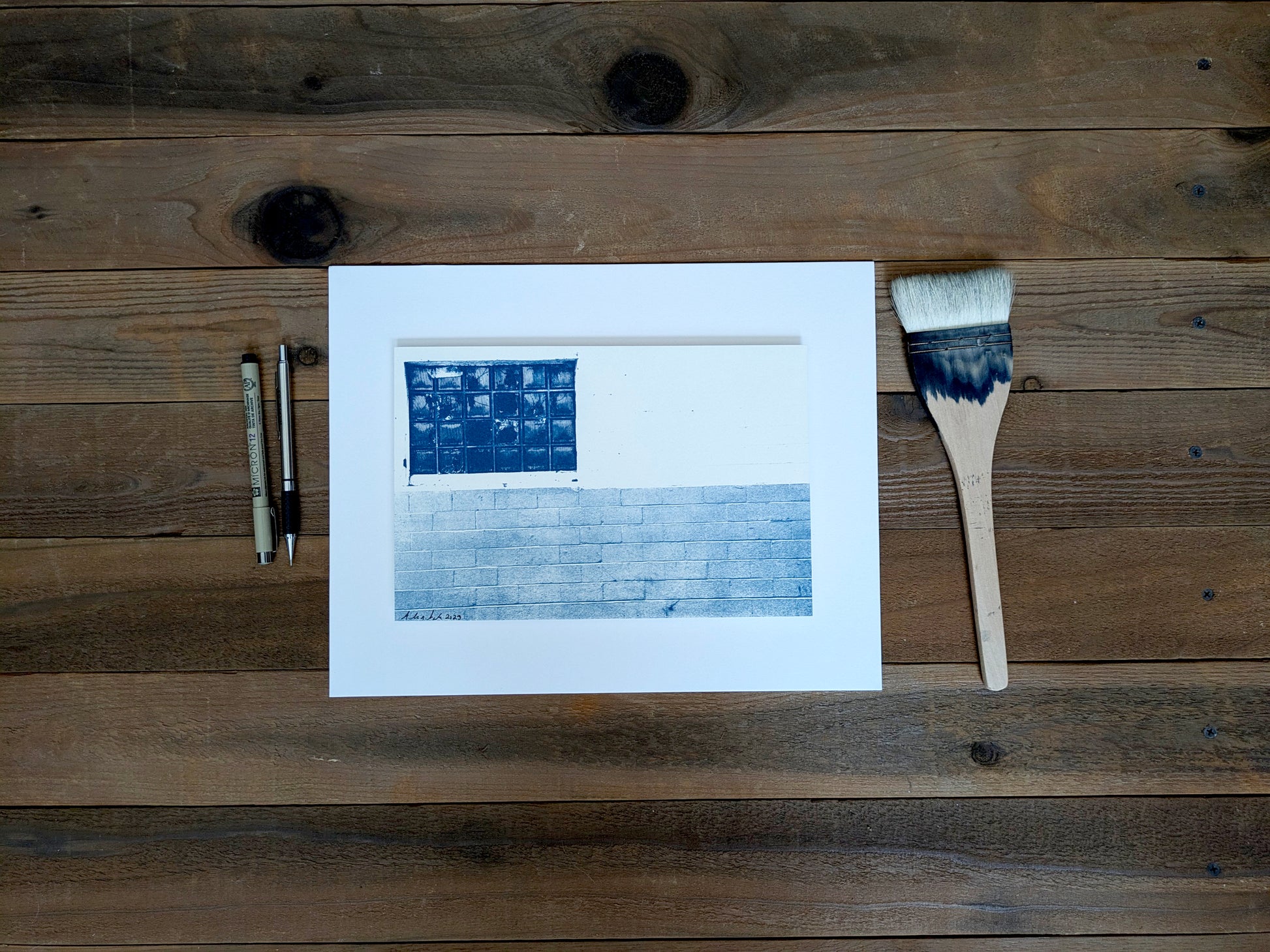This distinctive cyanotype print measures 7 by 10.5 inches and originates from the artist’s original photograph. Printed on archival hot press watercolor paper, it is float-mounted on an 11 by 17-inch matte board, ready to be framed and displayed right away.